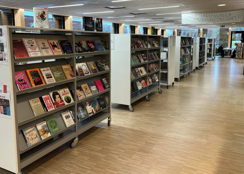Hvis du vil levere bøker utenom åpningstida, kan du legge dem i bokskapet på utsida av biblioteket.